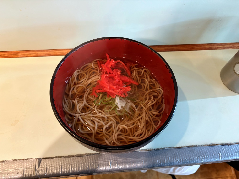 紅ショウガを無料でトッピングできるので、かけそばでもこんなに豪華。