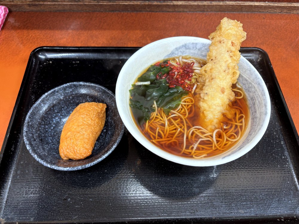 ちくわ天そばといなり寿司。いなり寿司をひとかじりしてつゆを飲むとたまらないおいしさ。口の中が幸せでいっぱいになる。